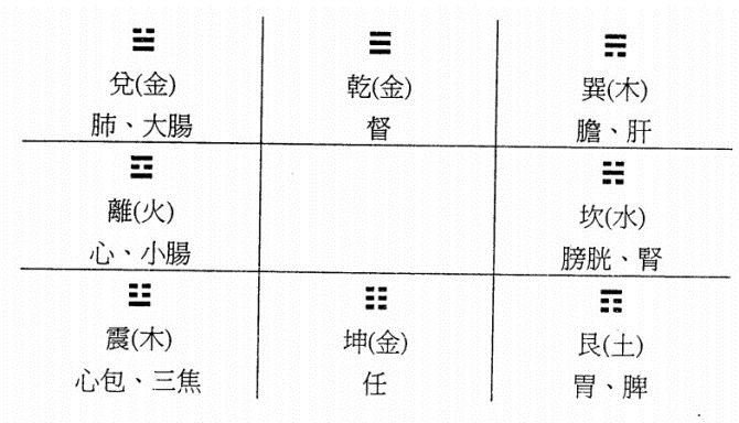再者,如果按先天八卦与十四经络的排列来看,则任督对应,肺大肠与脾胃对应,心包三焦与肝胆对应,心小肠与肾膀胱对应。这样四组对应之中,阴经对应阳经,阳经对应阴经,手经对应足经,这样形成了七对相互对应经络,即是临床常用对应取穴治疗思路。