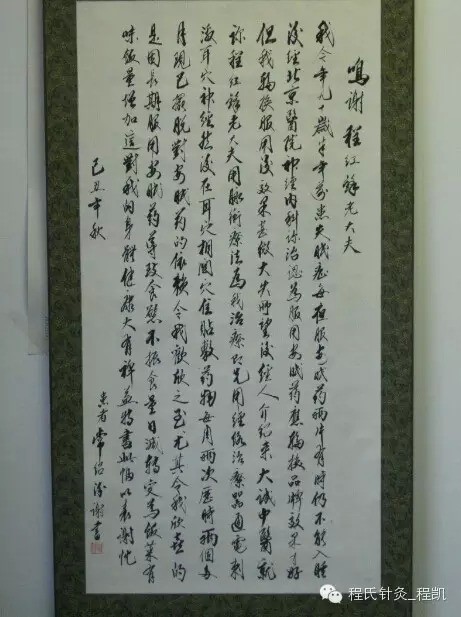 那是2009年初冬的一个清晨,外面大雪纷飞,第一场雪让空气清新了不少,父亲正在诊室准备医疗用品,却接到了一位失眠患者孙女打来的电话,说她爷爷失眠痊愈想表示感谢,特写了一封感谢信送来,谁知送来的不是一封普通的信,而一幅卷轴,打开一看,竟是书法手书的完整的治病过程、效果描述和感激言辞。现代社会,电脑、网络发达,人们忙忙碌碌,平时已经很少有手写书信的习惯,何况是用毛笔工整手书,更难得的是精心装裱成卷,谢意之诚溢于言表。