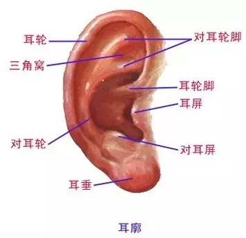 解剖学上把耳朵的耳廓由上至下分为﹕耳轮、三角窝、耳舟、耳甲艇、对耳轮、耳甲腔、耳屏、对耳屏、耳垂等几个部分。