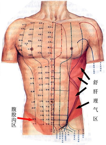 还有要重点治疗的就是下腹,特别是腹股沟会阴部那个区(大腿跟部与腹部交界的地方),这里是肝,脾、胃、肾,冲脉等几条重要经络汇集的地方,这里若有条索样的变性,点揉拨动很疼,多表明相关经络功能不良,有泌尿及生殖器疾病的应特别重视这个区域的治疗。
