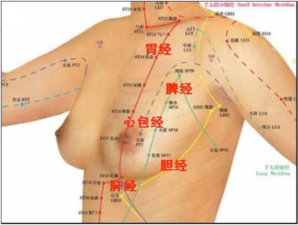 我以前脾气不好,经常抑郁,生闷气。从而总是两肋区闷胀,吃点东西就堵,老觉得呼吸费劲,喜欢大喘气。胃经常串气,胀疼,属于慢性胃炎范围。吃过很多胃药都没好,有次体检做B超检查,那个检查探头轻压腹部,我感觉到处刺痛,医生说我痛觉过敏,因为体检一切正常,没病。这种刺痛的现象,我在第一次推腹治疗时又出现了,用十个手指轻轻一压,顿时始觉得刺痛感到处都是,十分混乱,平日不碰一点感觉都没有。这时才明白那是我的经络在跟我拉警报,轻压表皮刺痛说明问题比较表浅,局部有淤血。当我冷静下来,对着经络图仔细分辨疼痛的路径,原来这些看来纷乱的痛点,几乎都规律的排列在胃经沿线,从锁骨到下腹,整个胃经都在疼。同时另外一条疼的路线是两边腋下的肝胆经走行。看来我的问题是主要肝气郁结加脾胃虚弱,于是我针对这两条经开始了进一步治疗。重点按揉那些疼的区域,简直可以用自虐来形容。