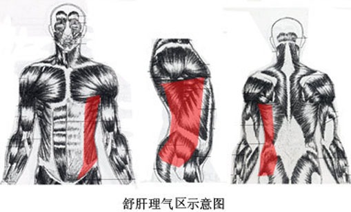 先看清楚肝胆区的范围,然后从腋下开始到胯部,用手捏住整个侧面身体的肌肉和皮肤,提起来,同时用手指捻,感觉里面有无条索样的东西或是疼痛的敏感点,发现敏感位置后,用拇指重点拨揉哪个地方,然后将整块皮肉拽起来向身体侧面揪拉,强刺激那些部位。重点刺激日月,期门,章门和京门、带脉几个要穴,治疗时候非常疼。头几次治疗后,表皮会过敏而痛不可触。我以前因各种原因生过太多闷气,那些毒素都存在了腋下这些胆经走行的地方,我那里的肉摸起来好象有许多网里面,还有结节筋一样的东西,可能就是所谓的橘皮组织,用手捏起来轻轻一抓,肉会很疼。每次用舒肝理气的手法,在肝胆经所过之处都很疼,然后胃肠串气,并伴随浊气释放。特别是在胃因胀气而串痛的时候,疗效最为立竿见影。若同时配合敲胆经和拨动胆经的阳陵泉,点肝经的太冲、曲池穴,舒肝理气的效果更佳。