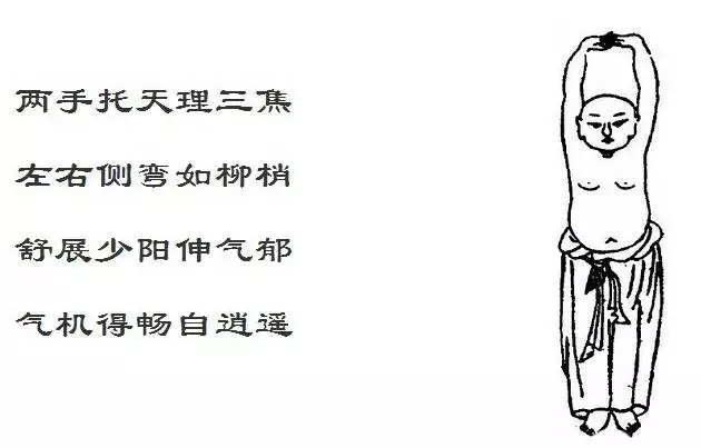 春天气机升发,人亦应之,若饮食起居不慎,则易致气郁,郁久不解,便易化火,火气并共,则百病丛生。此时,可依图中所示,左右侧弯,以舒展少阳经脉,经脉得舒,气机自畅,经舒气畅,火无从来,故诸病自愈矣。
